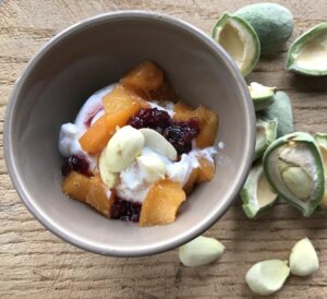 A vibrant celebration of the season’s first harvest, this bowl pairs creamy yogurt with thinly sliced stage 3 green almonds—tender young almonds just beginning to