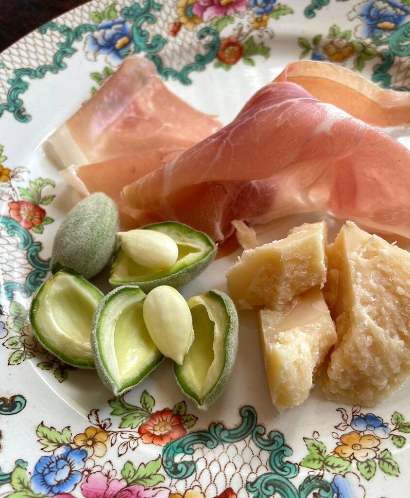 Eating whole green almonds with charcuterie and cheese such as this sliced Italian prosciutto is customary. The whole green almond is sour and crunchy, a nice contrast with the salty ham. We also cut them open to eat just the kernel. It is bright, fresh taste reminds me of a cucumber.