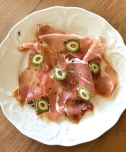 Eating whole green almonds with charcuterie and cheese such as this sliced Italian prosciutto is customary. The whole green almond is sour and crunchy, a